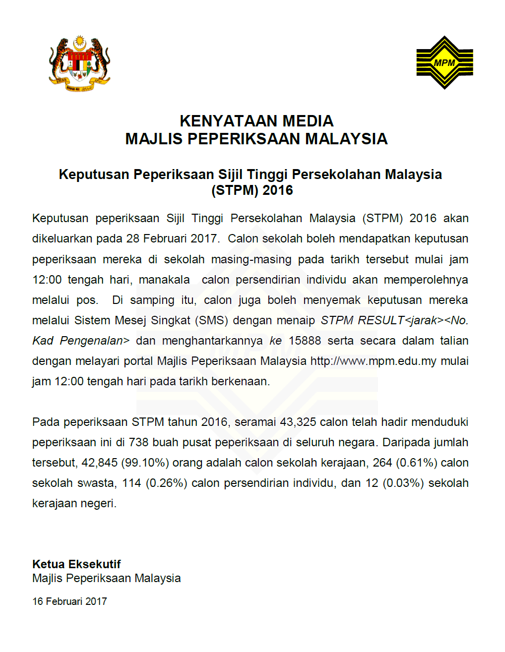 Pengumuman Keputusan Peperiksaan STPM 2016